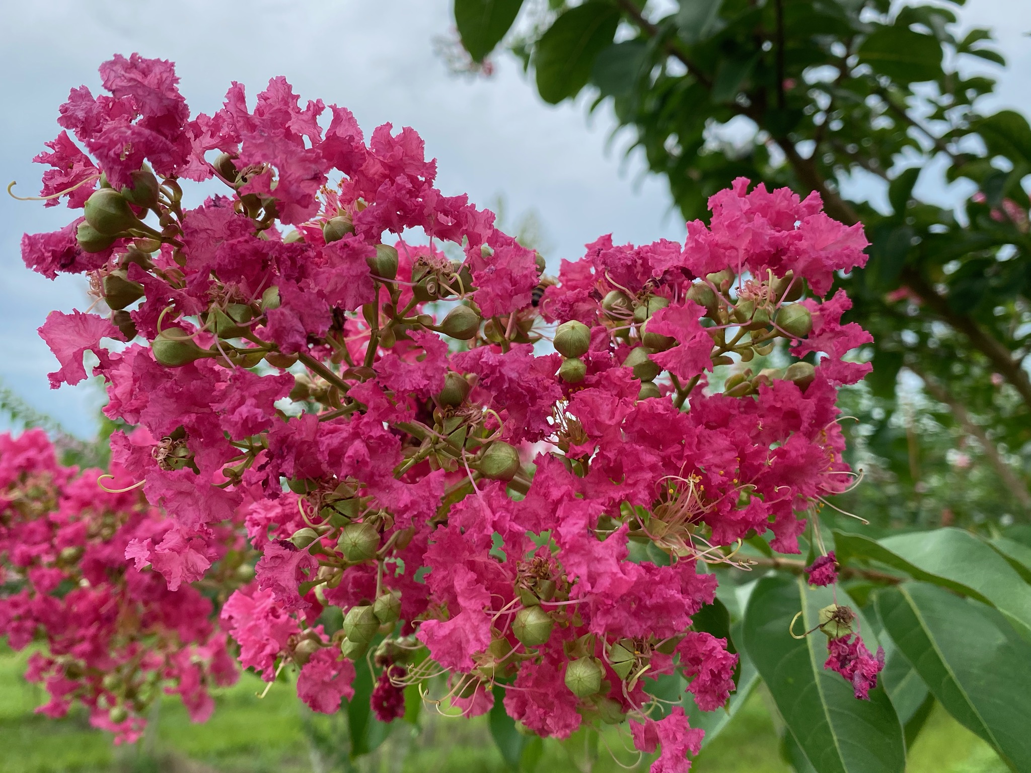 Flowers profusely during the summer months – produces large (6-12″) inflorescences of ‘watermelon’ flowers. Can be grown as a standard/single trunk tree. Exfoliating/peeling cinnamon colored bark.